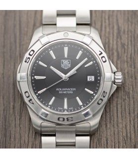 Aquaracer 300M - Mens Quartz Dive Watch€945.00For sale is a Swiss Made TAG Heuer Aquaracer men's quartz watch with reference number WAP1110, dating back to 2011 based on its warranty certificate. The stainless steel case measures 39mm in diameter and is just 10mm thick, which is relatively slim for a dive watch with depth rating of 300m. Behind the sapphire crystal sits a matte black dial with raised luminous numerals on which luminous baton shaped hands indicate the time. A date window is positioned at the 3 O'clock position. Surrounding the dial is a uni-directionally rotating bezel with luminous dot. The screw-down crown is original and signed with the TAG Heuer logo.