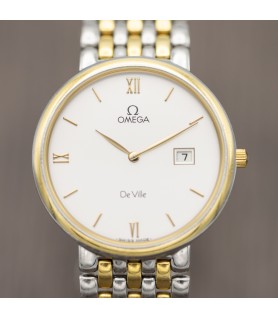 De Ville Ref. 396.2379 - Vintage Mens Quartz Dress Watch€945.00For sale is a vintage Swiss Made Omega De Ville men's dress watch with reference number 396.2379, presumably dating back to 1993 based on its serial number. The 32.5mm case measures just over 4mm in thickness, and features a gold inlay around the bezel of the stainless steel case. The watch comes with an integrated two tone "beads of rice" style bracelet with three rows of gold links and signed Omega clasp (Ref. 1500/820). Behind the sapphire crystal sits a matte creamy off-white/champagne dial with raised gold tone Roman numerals and a date window at 3 O'clock. Leaf style hands indicate the time, keeping the overall look of the watch face quite minimal and clean. The crown is original and bears the Omega logo.