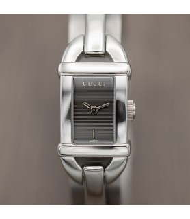 Bangle - Vintage Ladies Stainless Steel Cocktail Watch€375.00For sale is a neo-vintage Gucci ladies' cocktail watch with reference number 6800L, dating back to 2007 based on the warranty certificate. It features an intriguingly shaped rectangular 16mm by 22mm stainless steel case with integrated bangle bracelet, making it easily recognisable as a Gucci design. The dial is a dark grey, almost black colour with horizontal lining, changing its look depending on the lighting. The crown is original and bears the Gucci "G" logo. Powering this watch is a high quality Gucci 12 quartz movement based on the Swiss Made Ronda 732.