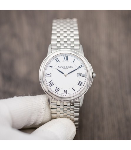 For sale is a Swiss Made Raymond Weil "Tradition" men's quartz watch, dating back to around 2010. The stainless steel case measures approximately 39mm, making it a fairly sizeable wristwatch. The white dial features Roman numerals and an outer railroad track, as well as a date window at the 3'O clock position. The crown is original and bears the Raymond Weil "RW" logo. Fitted to the watch is the original stainless steel bracelet with signed clasp: it will fit wrists with a maximum circumference of approximately 20cm. Resizing the bracelet to fit smaller wrists can easily be done by removing some links. In order to increase the size of the bracelet past 20cm, extra bracelet links will have to be sourced online or at an authorised dealership.