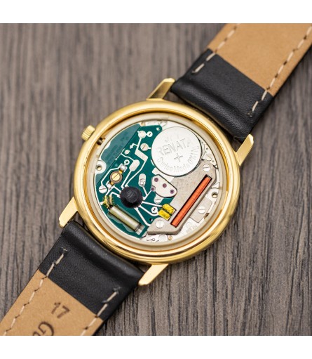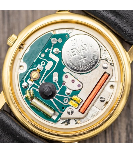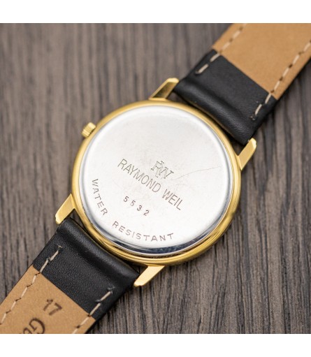 The example sold here has been worn throughout its life, but is still in good condition. The outside case has been cleaned entirely, but left unpolished to maintain its sharp edges and curves. You might find some slight wear marks on the case when closely examining the watch. Please study the pictures in this listing well: they show the watch in the condition that it is in, with no digital enhancements to make it look better than it is. We are sure that you like honesty, and so do we. Functionally, the watch was thoroughly checked, received a new battery, and is working perfectly. It'll come accompanied by an original black Raymond Weil box with white outer sleeve.