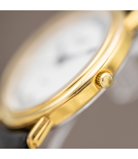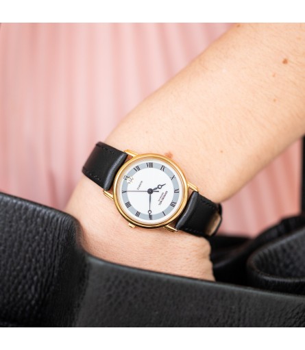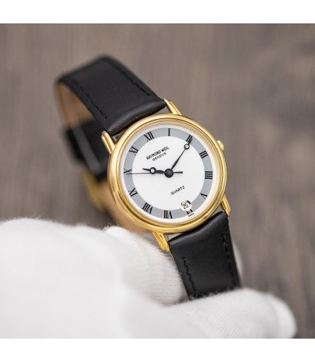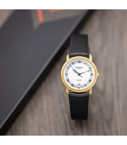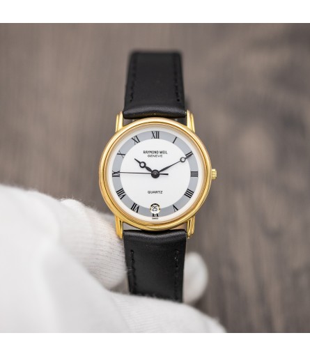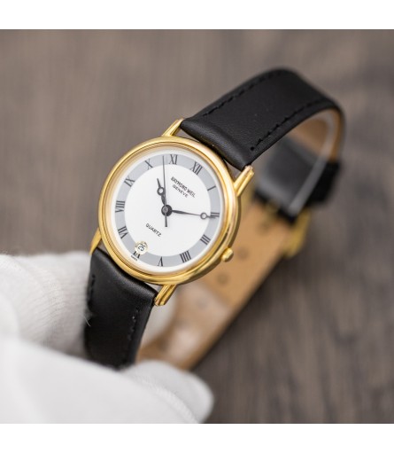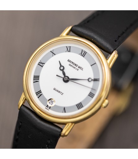 For sale is a Swiss Made Raymond Weil "Fidelio" quartz watch, dating back to the late 90s, early 2000s. It features a refined gold plated stainless steel case which measures 31mm in diameter. Given its relatively small size, it is advertised as a ladies' watch: however it would be perfectly suitable as a men's watch as well. The dial on this particular example comes in a bright white tone with grey outer ring featuring black Roman numerals. Breguet style hands are a hint to early 1900s pocket watches, and give the watch an antique twist. Inside the watch sits a high quality Swiss made quartz movement containing 7 jewels. The watch comes ready to wear on a matte black leather strap with original Raymond Weil signed gold plated buckle.