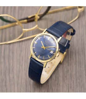Offered for sale is a vintage Swiss Made Pontiac Bilomatic "Golden Arrow" men's watch with reference 45500, dating back to the late 1960s. Pontiac may not be as famous since it is a brand with Belgian roots, but its craftsmanship was up to par with that of the more prominent brands of those days. The watch features a gold plated stainless steel case which combines gorgeously with the deep blue sunburst finish of the dial. Said dial is finished with matching gold tone accents as well as a date window at the 3 O'clock position. The watch is powered by a renowned Swiss Made AS 1717 automatic movement, containing 21 jewels. The watch comes with a fitting blue leather strap with generic buckle, to complete its vintage looks.