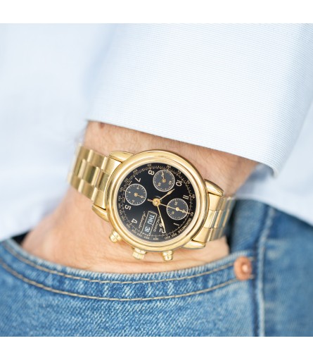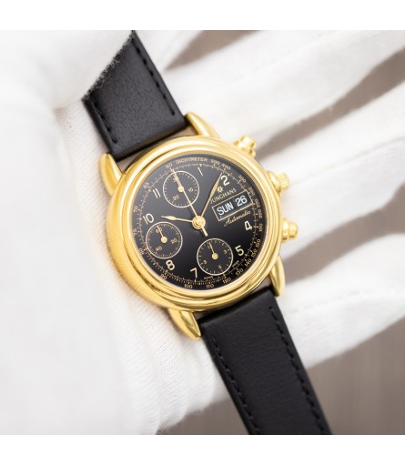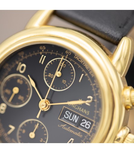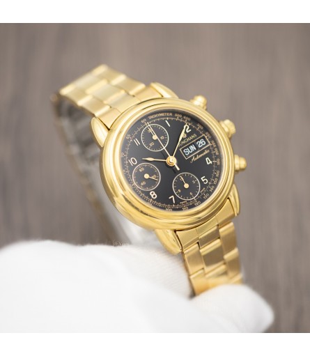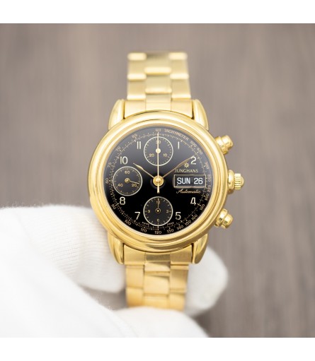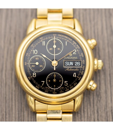 For sale is a vintage Swiss Made Junghans Chronograph watch with reference number 5196, presumably dating back to the early 1990s. It features a gold plated stainless steel case which measures approximately 38mm in diameter and just over 13mm in thickness. Behind the mineral crystal sits a gorgeous glossy black dial with contrasting gold tone numerals and hands. The dial boasts Arabic numerals as well as a tachymeter scale, finding inspiration from 1940s and 1950s chronographs. An English day and date window can be found at 3 O'Clock, as well as a chronograph complication in 6-9-12 configuration. Inside we find a high quality Swiss Made ETA 7750 calibre, a legendary automatic chronograph movement with 44 hours of power reserve. This calibre has been and is still widely used by the most renowned brands in watchmaking, and is known to be an absolute workhorse.
