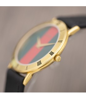 For sale is a Swiss Made Gucci men's watch with reference number 3000.2.M, presumably dating back to the early 2000s. The gold plated case measures 33mm in diameter, and is quite thin at just under 6mm. Behind the mineral crystal sits a gorgeously minimalist dial with nothing but the "Gucci" lettering on Gucci's signature green background with vertical red stripe. Plain gold tone dauphine hands indicate the time on black Roman numerals displayed on the gold plated bezel. The crown is original and signed with the Gucci logo.