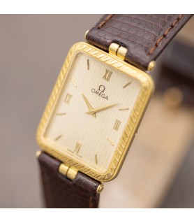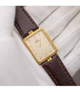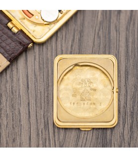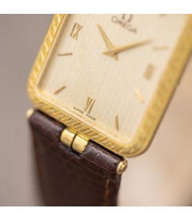 The watch features a slender 18k solid yellow gold rectangular case, measuring 24.5mm by 29.5mm and just over 5mm thick. It looks to have the exact case design of the infamous Omega "La Magique", but without the transparent dial. The bezel is adorned with an intricately engraved pattern. The case does not have typical lugs, but instead uses a central "T-Bar" design to attach the strap. The dial on this particular example comes in sparkly gold finish with vertical lining, with gold tone Dauphine hands indicating the time on gold tone indices. Inside the watch sits a high quality Omega 1365 quartz movement, which is working perfectly. The crown is original, and not your typical crown either: it is a recessed button to the side of the case, which can be pressed to adjust the hands. The watch comes fitted to a brand new and custom made brown leather strap, as well as a custom made black leather strap which allows the new owner to change things up from time to time. The buckle is original, crafted from solid 18k yellow gold, and with lining matching that of the case design.
