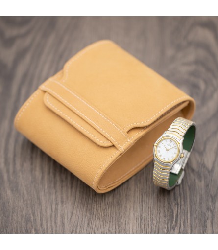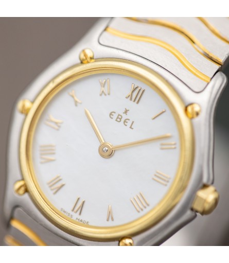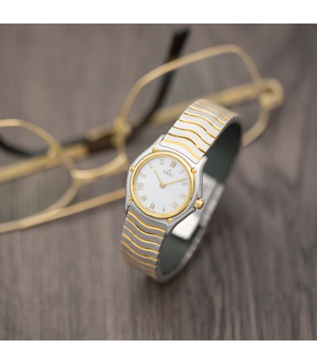 For sale is a Swiss Made Ebel Wave Sport, a vintage ladies' watch presumably dating back to the mid 1990s. This elegant two-tone watch features a 27mm by 24mm case crafted from stainless steel with a solid 18k yellow gold bezel. The dial is finished in a lovely Mother of Pearl, with gold tone hands indicating the time on raised Roman numerals. The case seamlessly flows over into the original integrated (yet removable) stainless steel bracelet, with the wavy pattern (of which the watch derived its name) accentuated in gold. The buckle is signed with the Ebel logo, while the original crown features a hexagonal screw design. A precise Swiss Made quartz movement animates the watch: a highly regarded Caliber 90, made by Cartier and used in a wide variety of high end watches by both Cartier themselves, as well as brands such as Ebel.