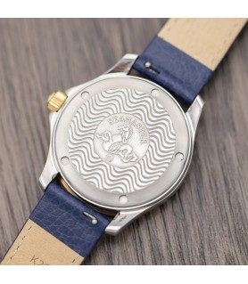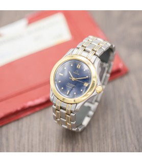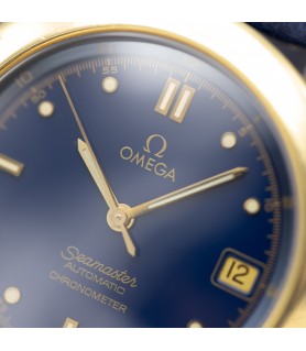 For sale is a Swiss Made Omega Seamaster Automatic Chronometer men's watch with reference number 168.1501, dating back to 1998. The watch features a 36mm stainless steel case with solid gold bezel, and the Seamaster's typical twisted lugs. The dial on this particular example is finished in a glossy blue tone, with gold tone accents all around. Luminous hands indicate the time on luminous indices, and a calendar window can be seen at the 3 o'clock position. Surrounding the dial is a fixed bezel crafted from solid 18k yellow gold. The screw-down crown is original, and decorated with the Omega symbol. Fitted to the watch comes the original Seamaster bracelet with signed clasp. Inside the watch sits a high quality Omega 1109 movement, which is Chronometer certified and working perfectly.