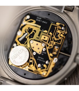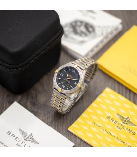 Said dial features luminous indices and hands, as well as as two LCD screens harbouring a number of intriguing features. The brains behind these features can be found in the Breitling calibre 65, a precision Swiss Made quartz movement which is accurately keeping time. This so-called ana-digital watch doubles as a 1/100th chronograph, alarm, countdown timer, second time zone, and calendar among others. All of these features are controlled by the crown that acts both as a regular crown and push button. Said crown is original and signed with the typical Breitling "B" logo. Fitted to the watch is its original two-tone titanium and gold Breitling bracelet. Said bracelet will currently accommodate wrists up to a diameter of 19.5cm
