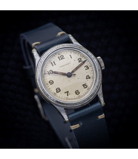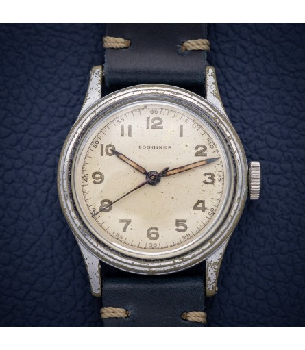 For sale is a Swiss Made Longines men's watch with reference number 23252, dating back to the 1940's. Even though no military markings can be found on the case, it would be no surprise that this watch has a certain military heritage: it shares quite a few design queues with its so-called "Dirty Dozen" counterparts. It features a very typical 40's military style three-piece case design with an outer diameter of around 33mm. The dial appears to be original, with a so-called open railroad track around the outside and Arabic numerals as indices. The blued steel hands are filled with lume that has developed a lovely darker patina over the years. A very typical big crown finishes off the watch.