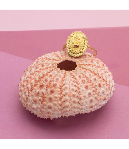 This lovely 18 k Yellow gold ring holds the most beautiful and popular love medallion of all times. This lovely medallion depicts a small cross and minus. Inside the plus we find a small but pretty and sparkly single cut diamond. The minus is set with two baguette cut rubies. When we look closely we see a small inscription in the medallion. Namely A.A, which stands for Alphonse Augis. He was a famous jeweller from Lyon who started making these types of love medallions. On top of that this stunning ring is hallmarked with a French eagle head.