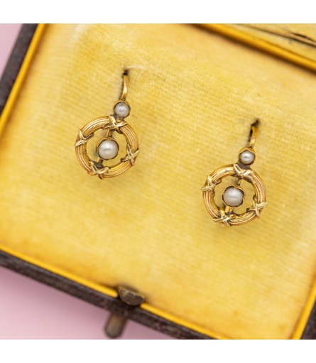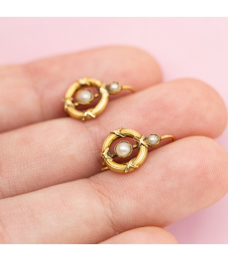 For sale are these cute seed pearl earrings. These 18 ct yellow gold earrings are very light and therefore very light and pleasant to wear. They are decorated with two small seed pearls each and encircled by a decorative raised border, which where frequently used in jewelry during this period. The fine details are well made and preserved considering their age. These round shaped beauties are not hallmarked but tested for 18k and made with love.