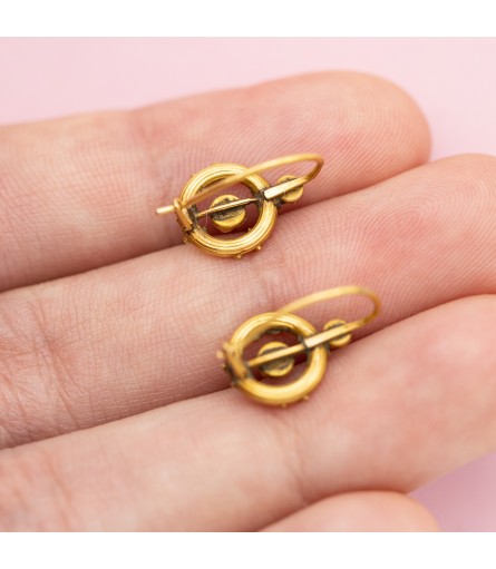 These lovely earrings where made during the 19th century, when Queen Victoria was the ruler of the United Kingdom. Queen Victoria was an influential person. Her style and sense of fashion became almost a benchmark during her reign. Queen Victoria has devoted much attention on bringing nature into her home and that of her nation throughout her reign. For example plants but also animals were often depicted in her jewellery but also as decoration on furniture and other utensils. We see two lovely geometric flowers in these dormeuse earrings.