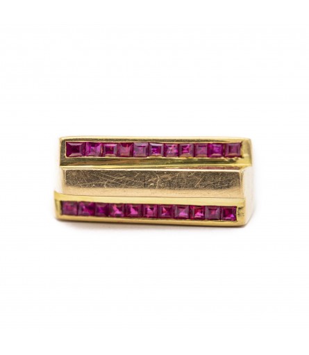 For sale is this lovely bulky asymmetric ring. This Ruby Tank ring is made in 18 k Yellow gold and marked with a French eagle head and a makers mark. This type of ring is called a Tank ring thanks to to the Tanks of the Second World War. These tank rings where mostly created during the 40's and 50's and are a perfect example of the retro style. They are heavy, voluminous and have often asymmetrical forms.
