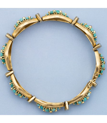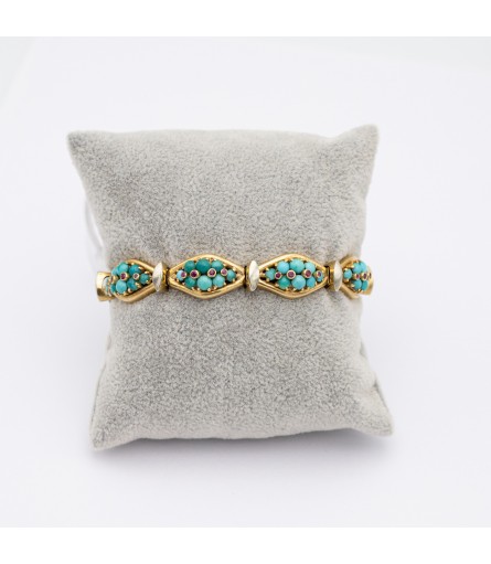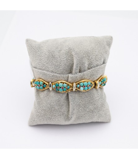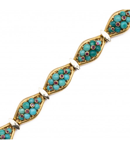 We are happy to introduce you to this wonderful Turquoise bracelet which stole our hearts the moment we laid our eyes on her. This 18 ct yellow gold bracelet is set with all colours of blue & Greenish blue cabochon turquoises. Each link is set with eight of them while four bezel set rubies bring extra warmth to each link. These colourful links are connected to each other with vertical marquise shaped connectors. They are finished with a white layer to make the turquoise links pop even more. This joyful bracelet is hand made before 1969 and marked with an Italian makers mark and a K18 mark. The box clasp is hidden and almost invisible when closed, what craftsmanship! On top of that it is secured with an extra small lock on the side of the bracelet.