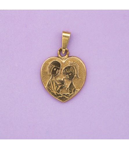 For sale is this lovely heart shape pendant crafted in 18 ct yellow gold. It features the two lovers drawn by the Parisian graphic designer Raymond Peynet. Les Amoureux was designed in 1942 and they become famous all around the world. This Estate charm is hallmarked with an 18k mark and a makers mark. On the back of this pendant we can read the elegant words: "Les Amoureux de Peynet" referring to the two lovebirds.
