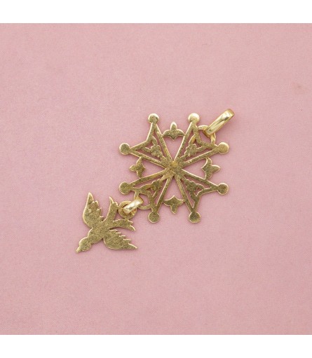 This French Huguenot cross is crafted in 18 K solid gold and depict a cross and a dove. This pendant is full of symbolic meanings. First of all we have the Maltese cross as an eminent symbol of the Christian faith. Then we have the boutonné, the eight points on the ends of the cross, symbolising the eight Beatitudes. Furthermore we see 4 fleur-de-lys in between the arms of the cross, They each have 3 petals; the total of twelve petals of the fleur-de-lys signify the twelve apostles. And on top of that, between each fleur-de-lys and the arms of the Maltese cross is an open space in the form of a heart, which represents loyalty. Lastly we see a very detailed dove on the bottom, also called a "Saint Esprit" thanks to a bible story where a dove of saint esprit descended from heaven to our earth with wings spread. This was seen as a sign of power and as a symbol of love.