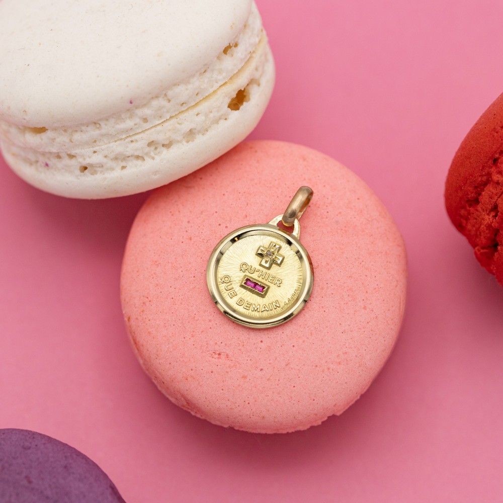 This vintage pendant is crafted in 18 ct yellow gold and is in-scripted with 'A. A' referring to the "inventor" of these stunning tokens. The plus on this charm is set with a small rose cut diamond, the minus with two sparkling red baguette cut rubies. They provide the perfect amount of colour to this wonderful charm with texture background and halo. And last but not least, this beauty is hallmarked with a French eagle head (and a vage, yet very recognisable Augis mark).
