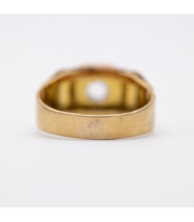 A central rose cut diamond steal the show, some geometric shapes flanking it give the ring some extra volume. This ring and its lovely gemstone where loved before and have been worn a lot. Due to this, the diamond is a bit damaged, this is not so visible with the naked eye, yet we like to let you know.