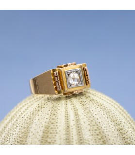 For sale is this lovely bulky Rose Cut diamond ring. This Tank ring is made in 18 k orangy Yellow gold and marked with a 0,750 mark. This type of ring is called a Tank ring thanks to to the Tanks of the Second World War. These tank rings where mostly created during the 40's and 50's and are a perfect example of the retro style.