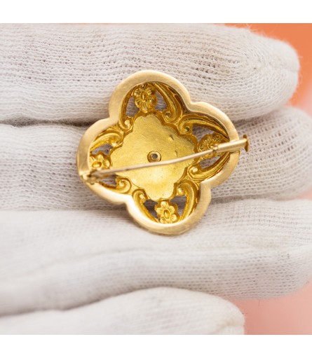 We are happy to introduce you to this work of art from the Napoleon III period during the early 20th century, also known as the late Victorian period. This collar brooch is crafted in 18 K solid gold and features a lovely floral decoration. In the center of this beauty, we find a small but lovely half seed pearl. The outer flower shape frame features small forget-me-not flowers, scrolls and leaves.