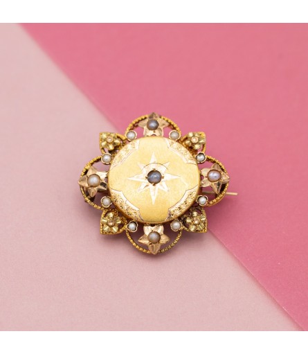 We are happy to introduce you to this work of art from the Napoleon III period during the late 19th century, also known as the late Victorian period. This floral star themed collar brooch is crafted 18 Karat solid gold and features stunning floral hand engraved decoration. In the centre of this beauty, we find a greyish half pearl, encircled by a star shaped engraving. This lovely round base is encircled with many little pearls. Some of them are set in little rounds, while others are set in marvellous little star. These stars are alternated with greenish gold flowers with a lot of detail. The many small details show how patient they have been in making such a beautiful jewel, purely handmade which still blows our minds.