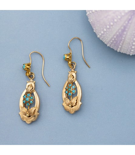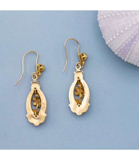 These lovely earrings where made when Queen Victoria was the ruler of the United Kingdom. Queen Victoria was an influential person. Her style and sense of fashion became almost a benchmark during her reign. She has devoted much attention on bringing nature into her home and that of her nation throughout her reign. For example plants but also animals were often depicted in her jewellery but also as decoration on furniture and other utensils.