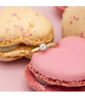 For sale is this lovely romantic brilliant cut diamond ring. This solitaire ring is made in 18 karat yellow gold and set with a brilliant cut diamond in the centre of the ring, this lovely diamond has an approx weight of 0,1ct and is prong set in a little white illusion ring, making the diamond appear a bit bigger. We adore this small minimal ring because it is romantic, elegant and can become a very special gift to someone to express your love.