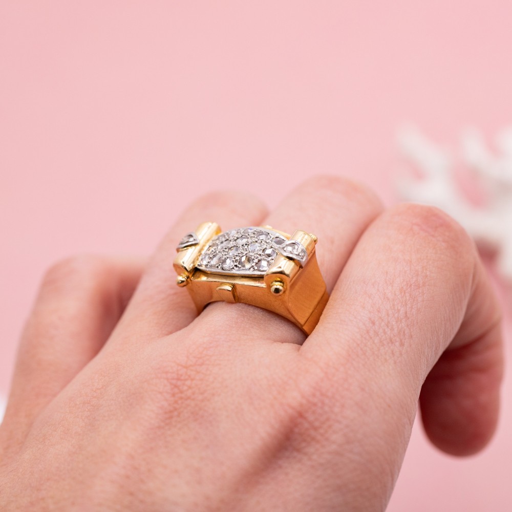 In the centre of this ring we see a white plate set with 18 rose cut diamonds, forming one sparkling whole. Two additional rose cut diamonds flank this plate on the raised yellow gold sides. Four small dots and two geometrical shapes give the ring a powerful look while the book like base of the ring finish the whole and turns this ring into a romanic beauty.