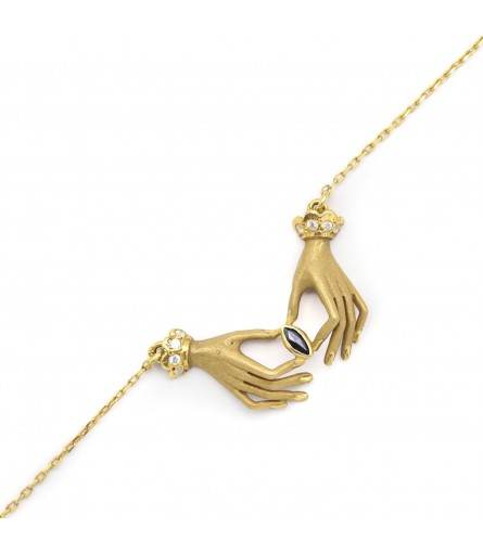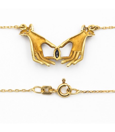 This stunning in Italy made necklace is made out of 18k yellow gold. The necklace depicts two small, elegant hands holding a marquise cut sapphire. These hands are made with the greatest care, they are finished to perfection. The small fingernails have a bright polish finish while the rest of the hand is brushed. There are wonderfully finished sleeves around the wrists of these hands. The sleeves are polished as bright as the fingernails and are decorated with four small old European cut diamonds on each side. These eight diamonds combine for approximately 0.54ct, the marquise sapphire is approximately 0.07ct.