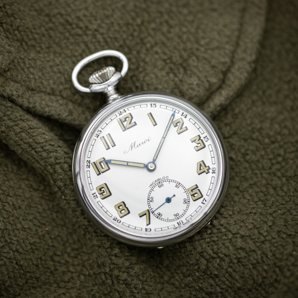 All original, freshly serviced and working perfectly: a vintage Swiss Made Mawi pocket watch. This piece presumably dates back to the mid 1960s, based on the age of the movement. The front features a glossy white enamel dial with gorgeously outlined luminous numerals and sword style hands. A sub dial at the 6 O'Clock position counts down the seconds. The dial has aged well with no overly coarse damage to speak of: no chips or cracks can be found, and all lettering is still very sharp and clear. It is housed in a metal open face pocket watch case measuring 50mm in diameter.