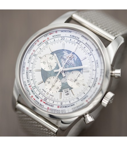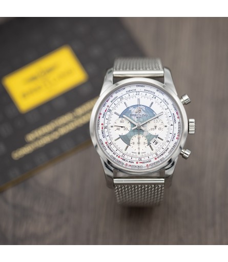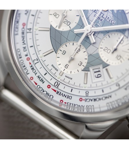 For sale is a stunning Breitling TransOcean Unitime Chronograph watch with reference AB0510, dating back to 2014 based on its digital warranty card. The case measures 46mm in diameter and 15mm in thickness, making it a fairly chunky watch. Its dial comes in a bright white finish, with a depiction of the globe in blue in the center. Luminous polished steel hands indicate the time, and a calendar window can be found in between 4 and 5 O'clock. a sub dial at 9 displays the seconds, while the sub dials at 3 and 6 display the chronograph minutes and hours respectively. Lastly, surrounding the dial sits a patented Double Disc World Time System showing 24 time zones.
